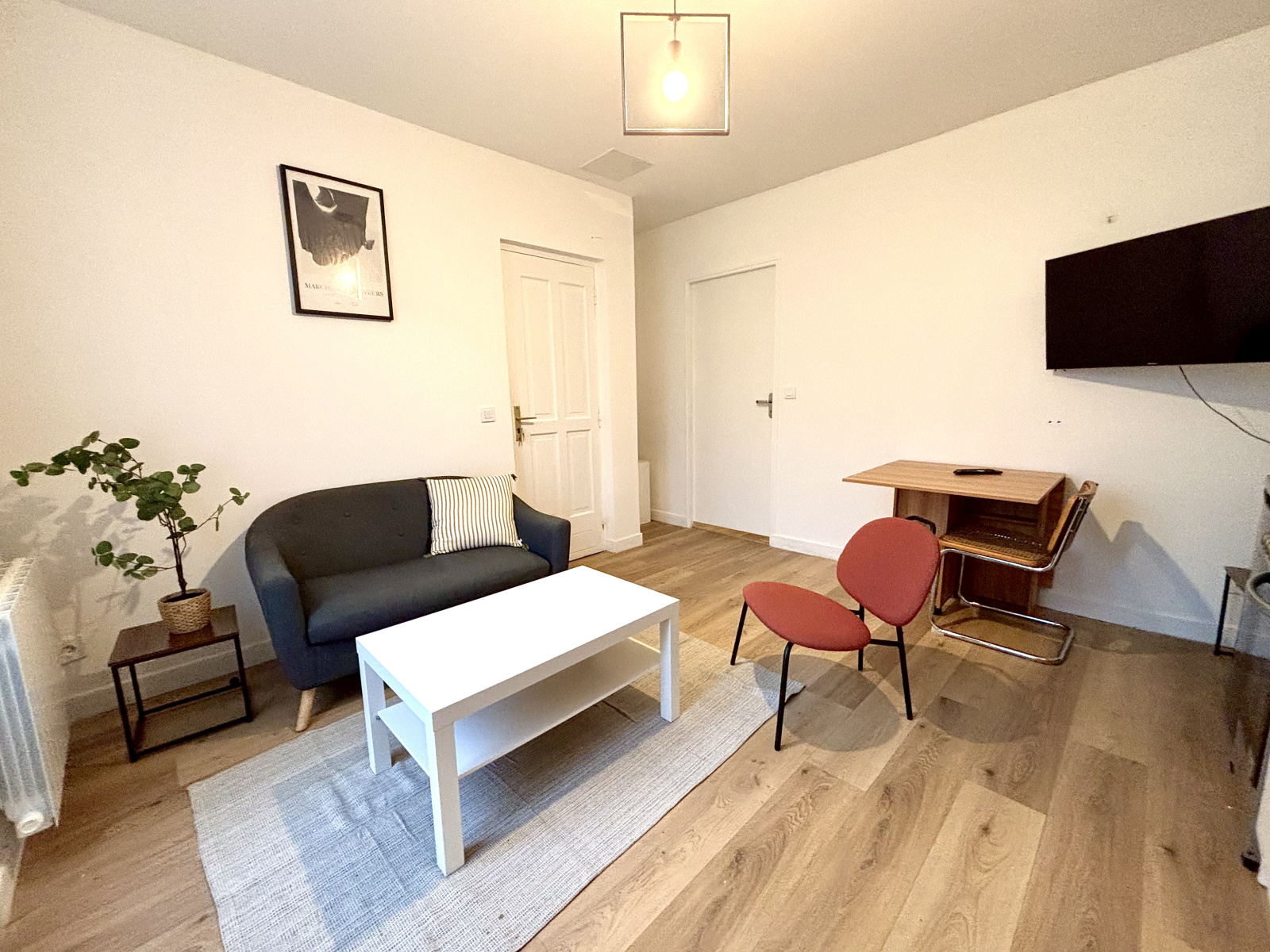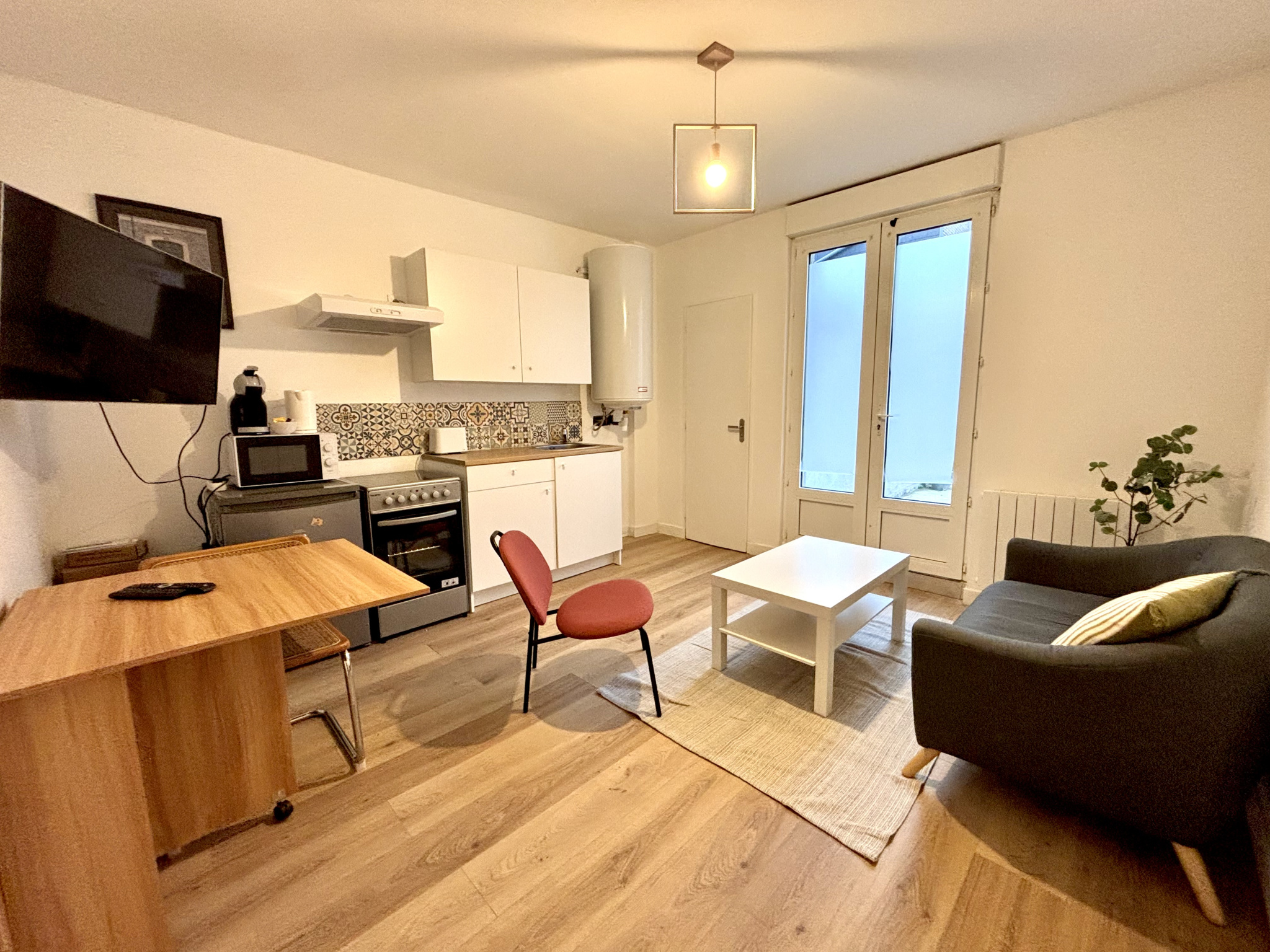 Appartement de type T2 d'une surface d'environ 32m2 situé au rez-de-chaussée d'une copropriété composé comme suit : un séjour, une cuisine équipée (plaque de cuisson, four, hotte, réfrigérateur, micro-onde), une chambre et une salle de douches avec WC.
