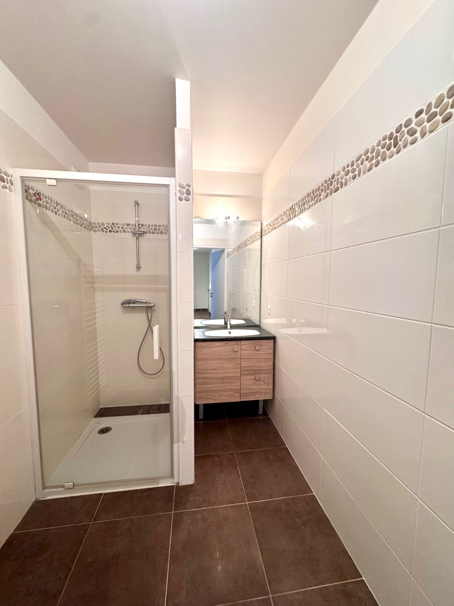 Situé au 4ème étage avec ascenseur, il comprends une entrée avec rangements, un séjour avec cuisine ouverte, un balcon-terrasse de 12 m2 (exposition EST), une salle de douches, un WC indépendant.